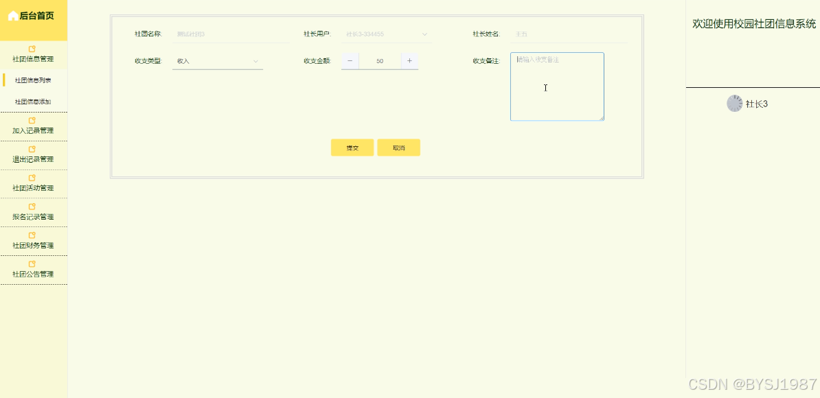 (6)社团财务管理:社长点击“社团财务管理”这一菜单,可以查看到自己添加的社团财务信息,也可以对社团财务进行增删改查。