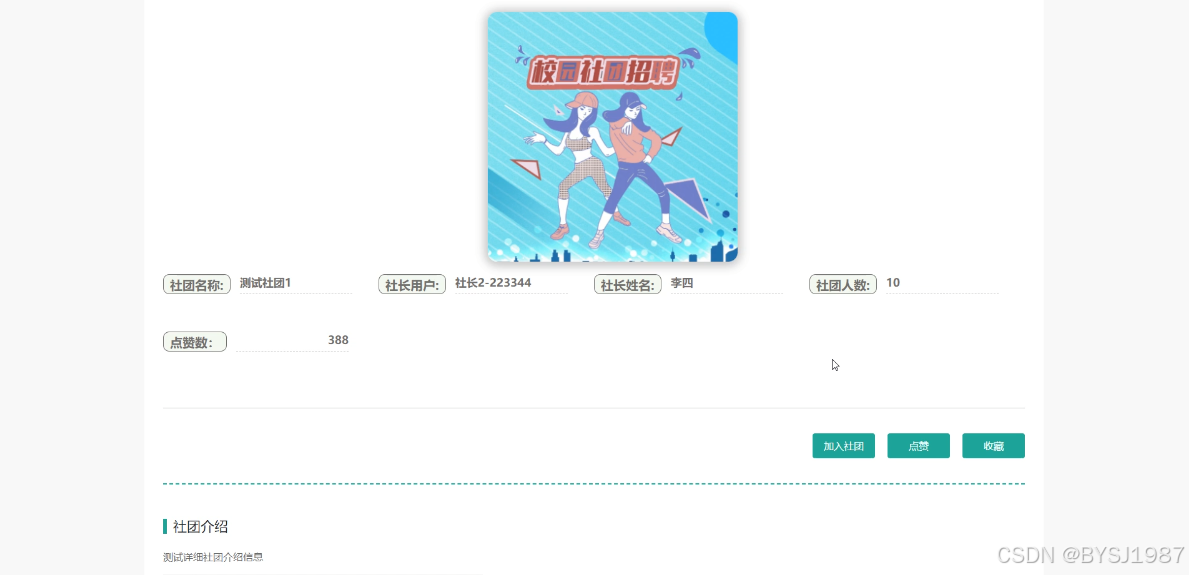 (5)社团信息:用户在前台点击“社团信息”这个菜单按钮,就会显示所有的社团列表,在查询到自己想要加入的社团时,可以进入查看详细的介绍,在这个界面,也可以对社团进行加入、点赞、收藏、评论操作。