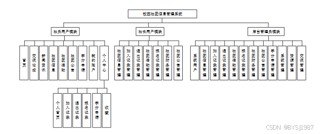 按照校园社团信息管理系统的角色,我划分为了社员用户模块、社长用户模块和管理员模块这三大部分。