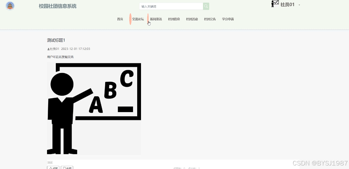 (3)交流论坛:在前台点击“交流论坛”按钮进入交流交流论坛,点击可以进入到已发布的交流文章详情,并且可以进行评论、收藏、点赞操作,发布新的交流帖子。