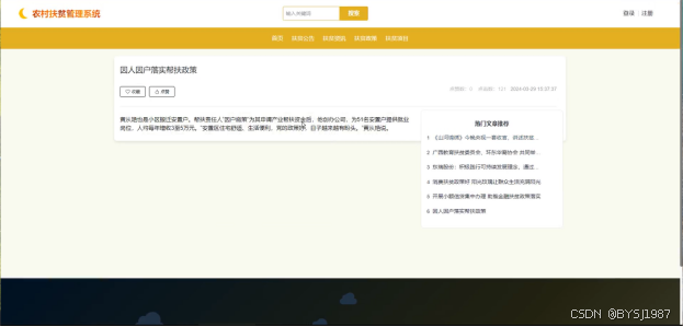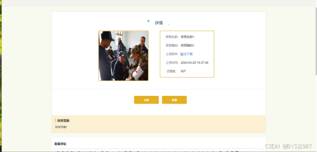 当用户点击“项目政策”,可以查看各级政府发布的扶贫政策文件和解读,方便用户了解政策内容。用户可以进行点赞、收藏、评论等操作。界面如下图4-3所示。