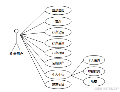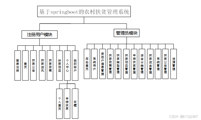 按照基于springboot的农村扶贫管理系统的角色,系统划分为了注册用户模块和管理员模块这两大部分。