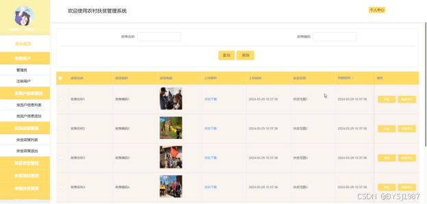 扶贫政策管理: 管理扶贫政策的发布和更新,包括政策文件上传、修改和删除等操作。