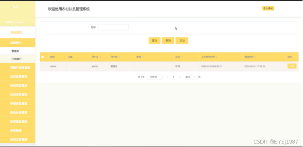 基于springboot的农村扶贫管理系统中的管理人员是可以对注册的注册用户进行管理的,也可以对管理员进行管控。界面如下图4-7所示。