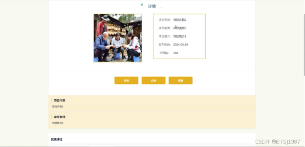 用户点击“扶贫项目”,可以仓库各类扶贫项目的信息,包括项目名称、申报条件等,用户可以进行申报、点赞、收藏。界面如下图所示。