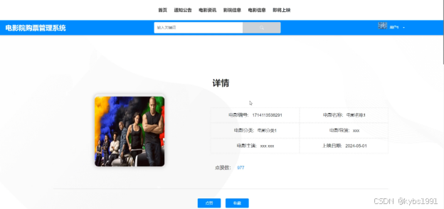 (6)电影信息:用户可以查看电影的所有信息,包括影院名称、电影编号、电影名称、电影分类、电影导演、电影主演、上映日期、电影时长、电影场次、放映影厅、放映时间、电影票价、影院地址、电影介绍等。支持通过电影名称或电影分类搜索的方式对电影信息进行查询,在查询到自己想要了解的电影信息的时候,可以进入查看详细的介绍,点击“购票”这一按钮以后会跳转到电影购票信息填写的界面,根据提示填写好购票的信息,点击“提交”以后购票就完成了,在电影信息详情这个界面,同时支持用户对喜欢的电影信息进行收藏、点赞以及评论的功能。