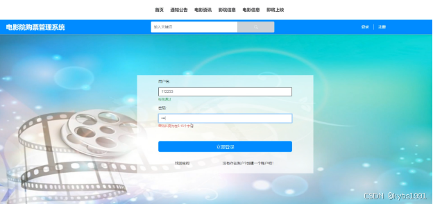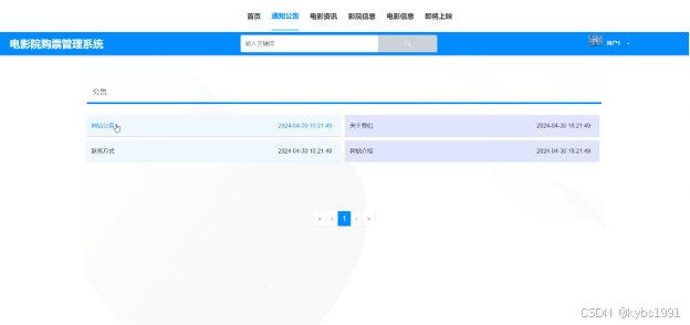 (2)查看电影院购票管理系统的首页信息:电影院购票管理系统的首页信息包含了首页、通知公告、电影资讯、影院信息、电影信息、即将上映等。
