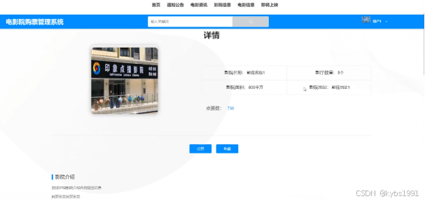 (5)影院信息:普通用户可以搜索、浏览和查看影院信息,包括影院的影院名称、影厅数量、影院面积、影院地址、影院介绍等。用户可以选择感兴趣的影院并查看更多详细信息并进行点赞、收藏和评论操作。