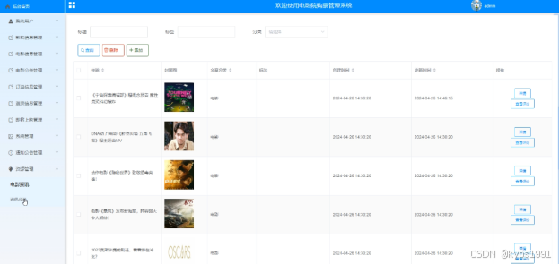 (11)资源管理:管理员可以对电影院购票管理系统前台展示的电影资讯以及电影资讯所属的分类进行管控。