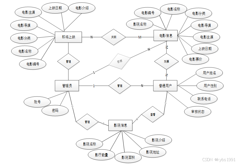 下面是整个电影院购票管理系统中主要的数据库表总E-R实体关系图。