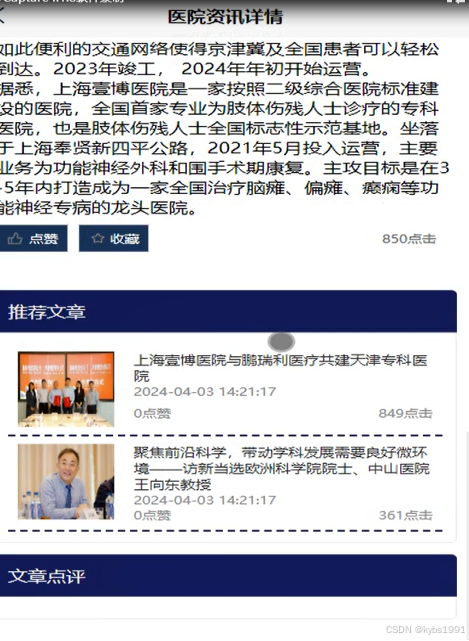 医生用户可以查看医院相关的资讯内容,包括医院动态、科室介绍、医生排班等,方便医生了解医院信息和就诊流程。在详情页面可以点赞、收藏和评论。界面如4-6所示。