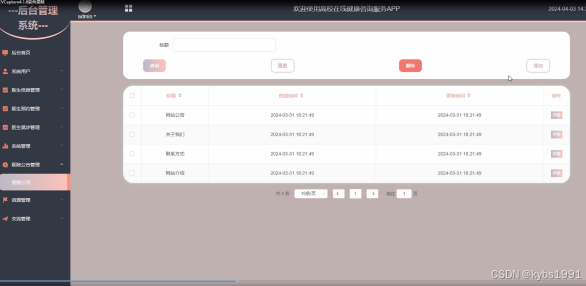 管理员可以发布、编辑、删除系统的医院公告信息,包括健康宣教、医疗政策等内容,确保信息及时传达给用户。界面如图4-13所示。
