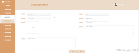 失物招领管理:宿管点击可查看失物招领列表和失物招领添加;点击“失物招领添加”,选择发布账号,输入宿管名称、宿管电话、物品名称,上传物品图片,选择拾取时间,输入物品描述和认领途径,点击“提交”按钮进行添加。界面图如下。