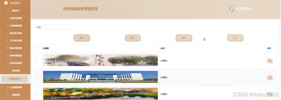 系统管理:当管理员点击”系统管理“这一菜单时,可查看轮播图管理,如需添加新的轮播图,点击下方”添加“按钮,上传轮播图,填写标题,点击“提交”按钮进行添加。同时管理员可对轮播图进行增删改查。界面展示如下图5-1所示。