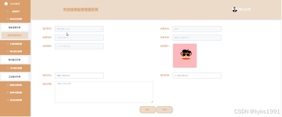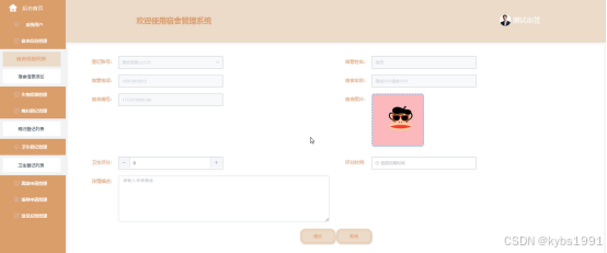 点击“卫生登记”可填写卫生登记信息,包括登记账号、宿管姓名、宿管电话、宿舍名称、宿舍编号、宿舍图片、卫生评分、评分时间和详情描述。界面图如下。