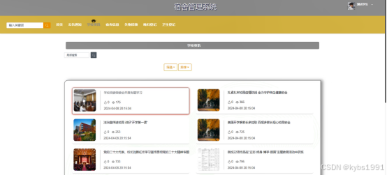 宿舍信息:用户点击可通过搜索宿舍名称、宿舍编号、宿管姓名和宿管电话进行查看宿舍信息,可对宿舍信息点赞、收藏和评论,同时可进行报修、反馈和离宿操作。界面图如下。