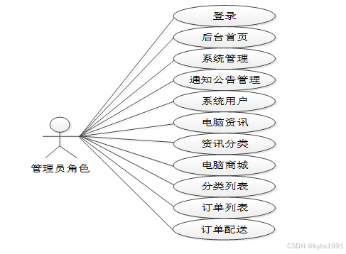 web后台管理上的管理员是维护整个电脑商城系统中所有数据信息的,管理员可以进行登录、系统用户(管理员、普通用户)、系统管理、通知公告管理、资源管理(电脑资讯、资讯分类)、商城管理(商城中心、分类列表、订单列表、订单配送)等。管理员角色用例如图2-2所示。