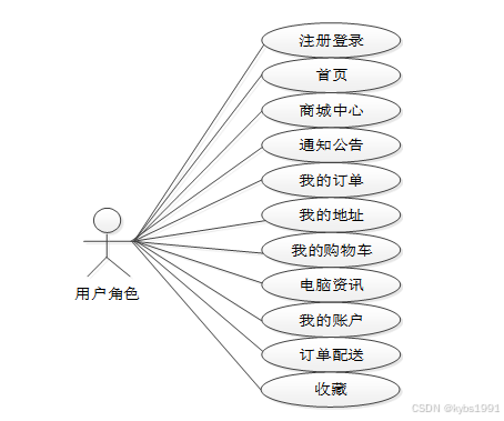 电脑商城系统的完整UML用例图分别是图2-1和图2-2及图2-3。在参与者上包括用户和卖家以及管理员。前台上用户角色用例包括用户是注册成为我们正是的用户、用户登录、通知公告、电脑资讯、商城中心、商城管理(我的购物车、我的订单、我的地址)、我的账户、个人中心(订单配送、收藏)等功能。用户角色用例如图2-1所示。