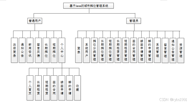 根据第二章中城市摊位管理系统的功能分析可知,城市摊位管理系统中整体功能模块图如图3.1所示,