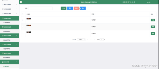 系统管理:当管理员点击”系统管理“这一菜单时,可查看轮播图管理,如需添加新的轮播图,点击下方”添加“按钮,上传轮播图,填写标题,点击“提交”按钮进行添加。同时管理员可对轮播图进行增删改查。界面图如下。