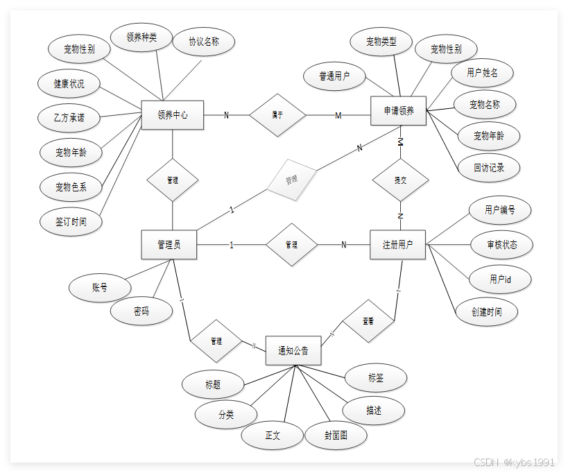 下面是整个流浪动物领养管理系统中主要的数据库表总E-R实体关系图。