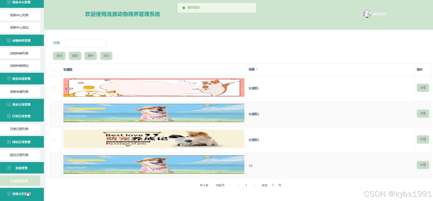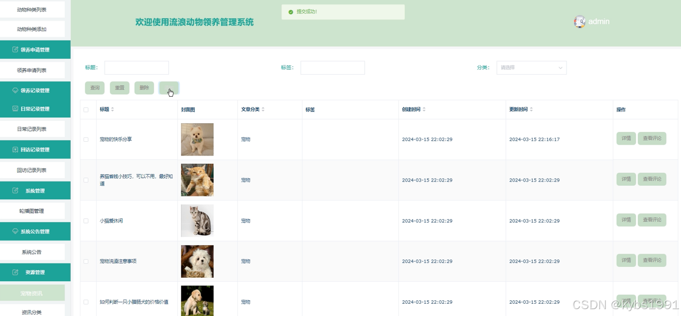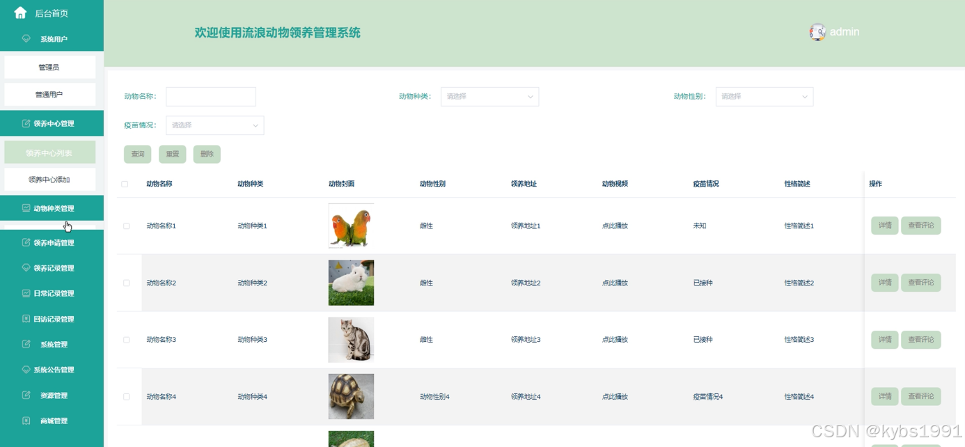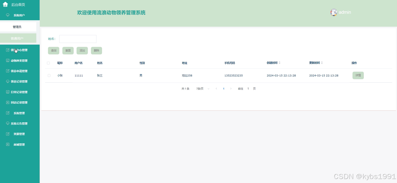 领养中心管理,管理员可以查看到宠物领养详细信息,并且可以根据详情进行查询、删除、添加等操作,如图5-4所示。