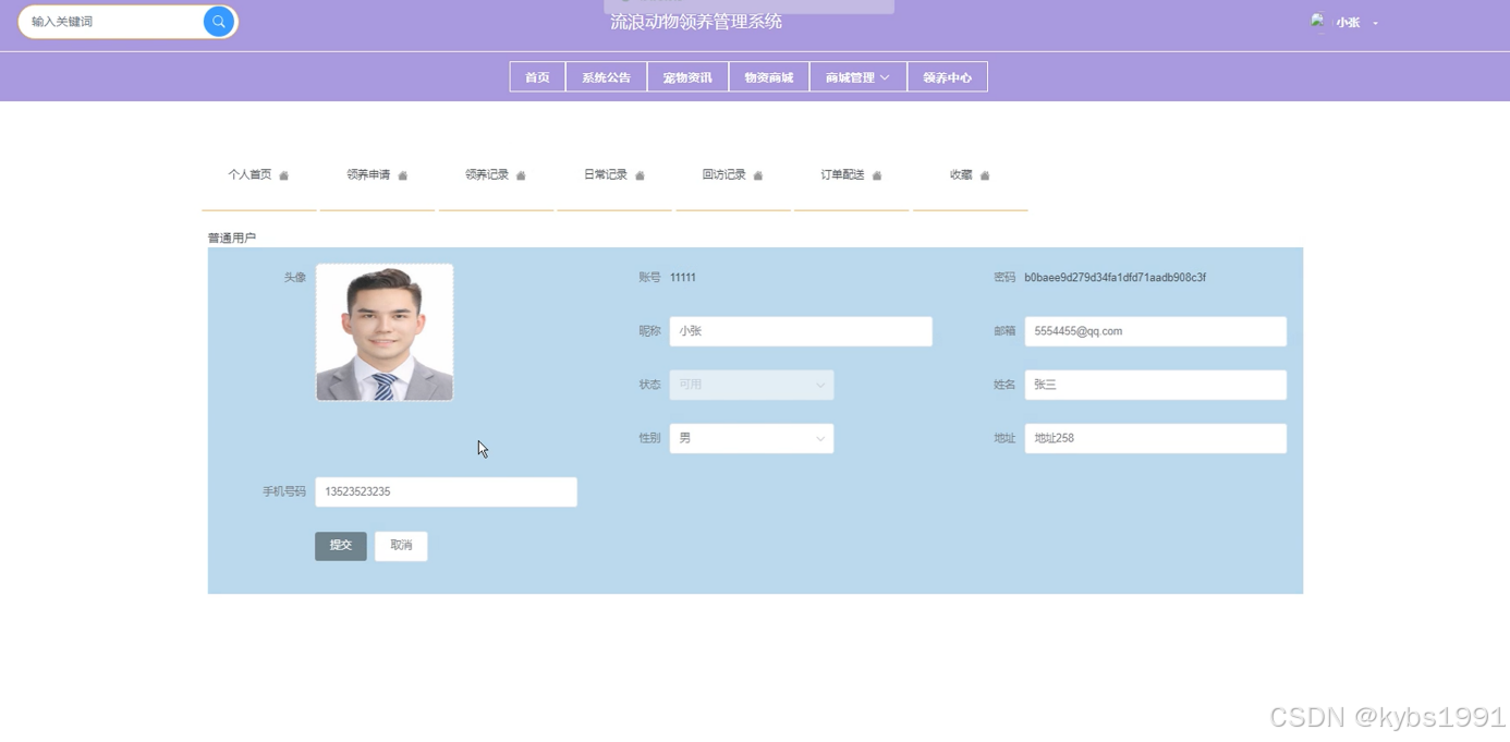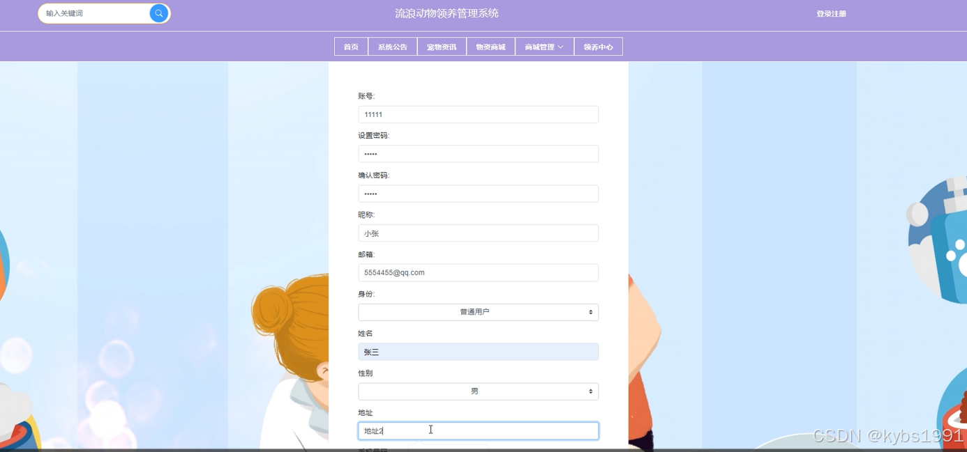 普通用户登录进入流浪动物领养管理系统可以填写个人信息进行用户注册等内容。如图5-8。
