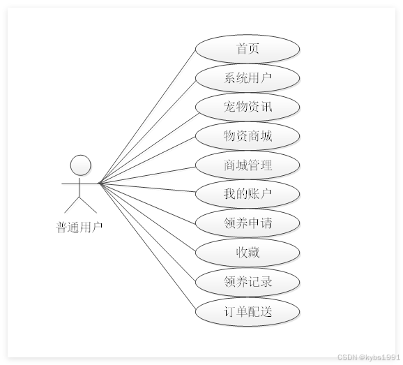 普通用户进入系统可以查看:首页、系统公告、宠物资讯、物资商城、商城管理、我的账户、个人中心(领养申请、领养记录、订单配送、收藏)等。普通用户用例如图3-7所示。