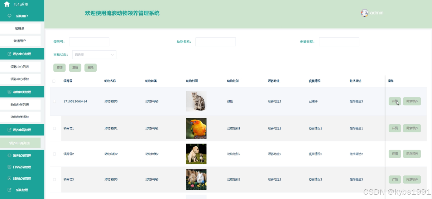 领养申请管理,管理员可以查看到领养申请详细信息,并且可以根据详情进行查询、删除、添加,同意领养等操作,如图5-5。