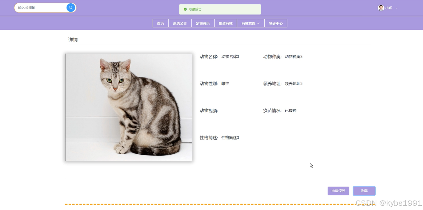 当用户点击“领养中心”这一菜单会显示领养中心详情,根据详情进行相对应的点赞、收藏、申请领养、评论等操作,如图5-10。
