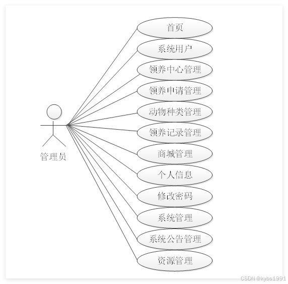 系统中的核心用户是系统管理员,管理员登录后,通过管理员来管理后台系统。主要功能有:首页、系统用户(管理员、普通用户)、领养中心管理、领养申请管理、动物种类管理、领养记录管理、商城管理、系统管理、领养公告管理、资源管理、个人信息、修改密码等功能。管理员用例如图3-6所示。