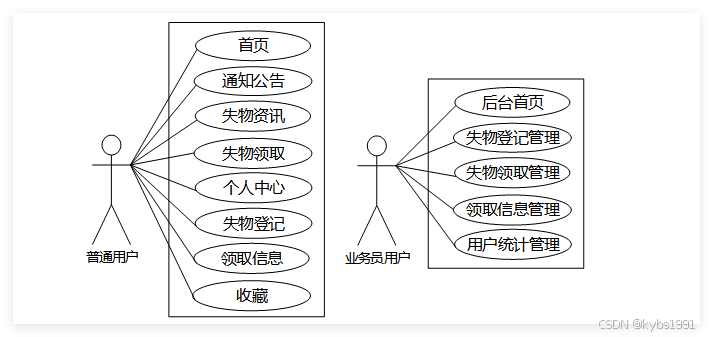 失物招领系统普通用户包括首页、通知公告、失物资讯、失物领取、个人中心、失物登记、领取信息、收藏等功能,业务员用户功能包括后台首页、失物登记管理、失物领取管理、领取信息管理、用户统计管理等功能。用例图如图2.1所示: