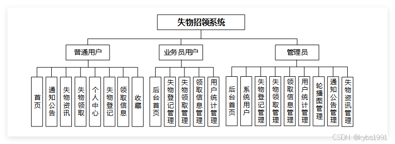通过上一章节的功能需求分析,可以得出本失物招领系统的功能结构图,图3.1就是系统的功能模块图。