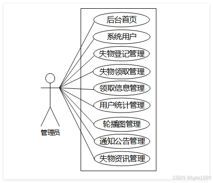 失物招领系统中管理员角色功能包含了后台首页、系统用户(管理员、业务员用户、普通用户)、失物登记管理、失物领取管理、领取信息管理、用户统计管理、轮播图管理、通知公告管理、失物资讯管理等功能,管理员的用例图如图2.2所示: