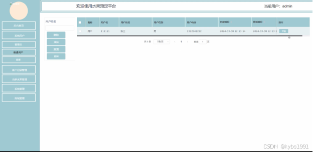 基于Web的水果预定平台中的管理人员是可以对注册的普通用户、卖家用户进行管理的,也可以对管理员进行管控。界面如下图4-13所示。