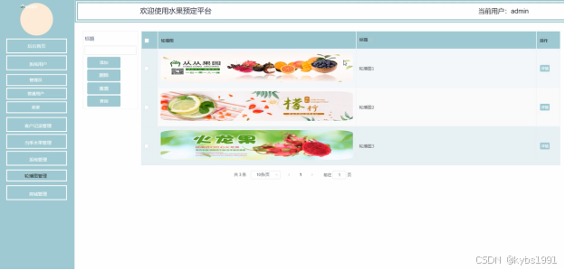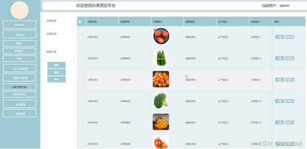 管理员点击“当季水果管理”菜单,管理员可以管理当季水果信息,包括添加、修改、删除等。界面如下图所示。