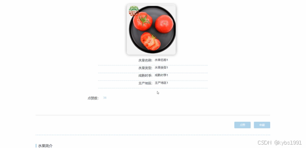 用户点击“当季水果”可查看所有的当季水果,点击可查看详情,用户可以进行点赞、收藏、评论等操作,界面如下图所示。