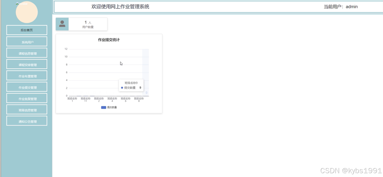 管理员登录进入网上作业管理系统可以查看后台首页、系统用户、课程信息管理、课程安排管理、作业布置管理、作业提交管理、作业批复管理、班级信息管理、通知公告管理等功能内容,如图5-2所示。