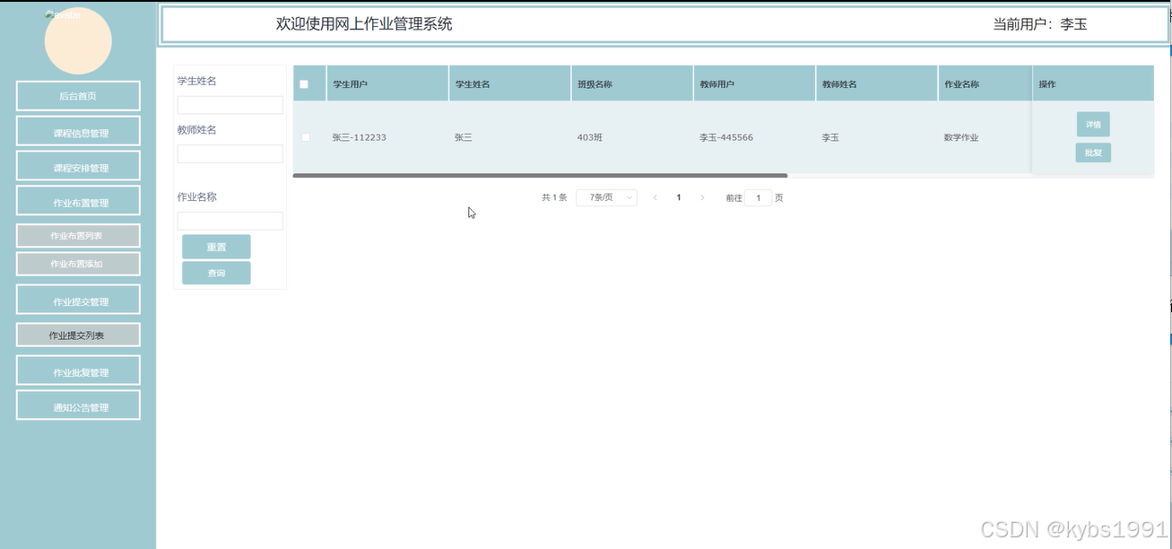 通过作业提交管理页面,教师用户可以查看学生作业提交列表,查看作业详情,对学生作业进行批复,进行查询和重置操作,通过学生姓名、教师姓名和作业名称进行搜索,还可以下载学生提交的作业文件,如图5-6所示。