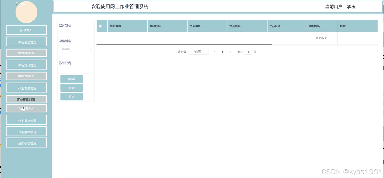 作业布置管理,教师用户可以查看已布置作业列表,添加新作业,进行查询和重置操作,删除不必要的作业,查看作业详情。通过教师姓名、学生姓名和作业名称进行搜索,方便管理和调整作业布置,如图5-5所示。