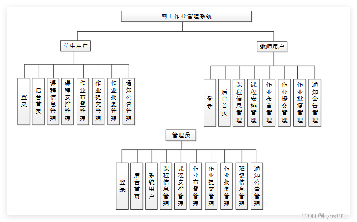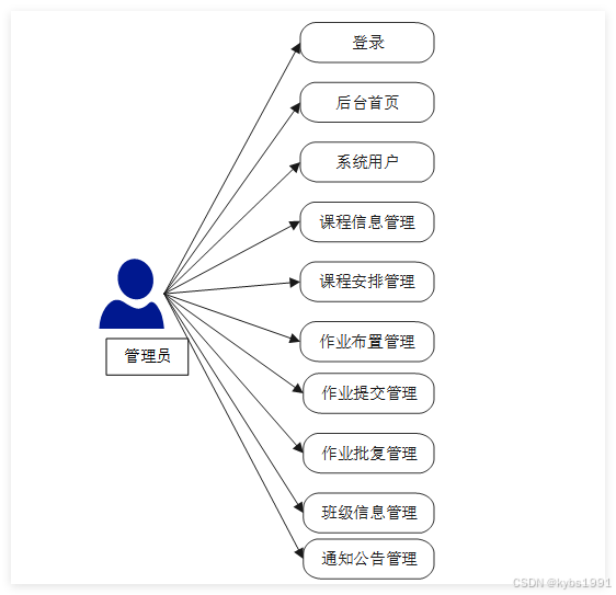web后台管理上的管理员是维护整个网上作业管理系统中所有数据信息的,管理员可以进行登录、后台首页、系统用户、课程信息管理、课程安排管理、作业布置管理、作业提交管理、作业批复管理、班级信息管理、通知公告管理。管理员角色用例如图3-3所示。