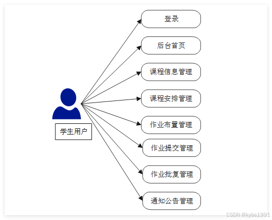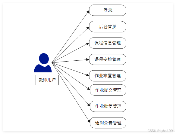 教师用户角色用例包括后台首页、课程信息管理、课程安排管理、作业布置管理、作业提交管理、作业批复管理、通知公告管理,教师用户角色用例如图3-1所示。