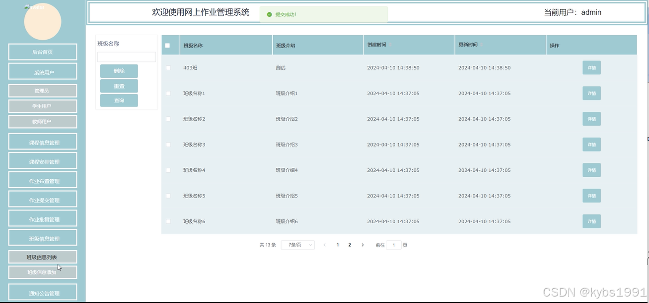 3、该系统具有完善的功能,包括管理首页、系统用户、学校院系管理、班级名称管理、课程分类管理、课程作业管理、上交作业管理、评估反馈管理、通知提醒管理、系统管理、通知公告管理、资源管理、交流管理等。此外,还提供了维护和更新模块的功能。
