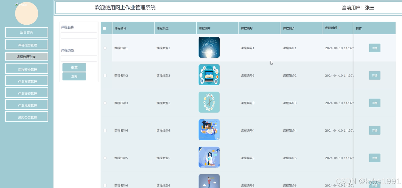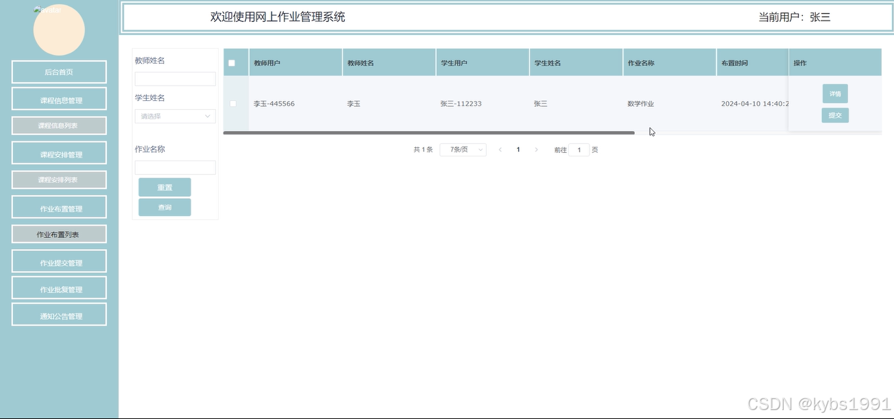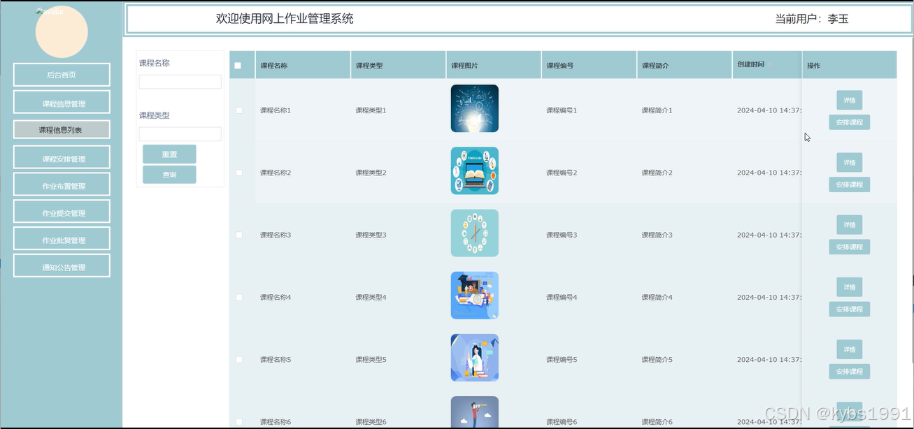 In the software development process, the system adopts an object-oriented development model, combined with MySQL database as the backend data storage unit, and uses SpringBoot framework, Java technology, and Ajax technology for coding and development, achieving comprehensive functionality of the system. Administrators and teacher users can manage course information, homework assignments, homework submission and approval, while student users can submit homework and view relevant notification announcements.