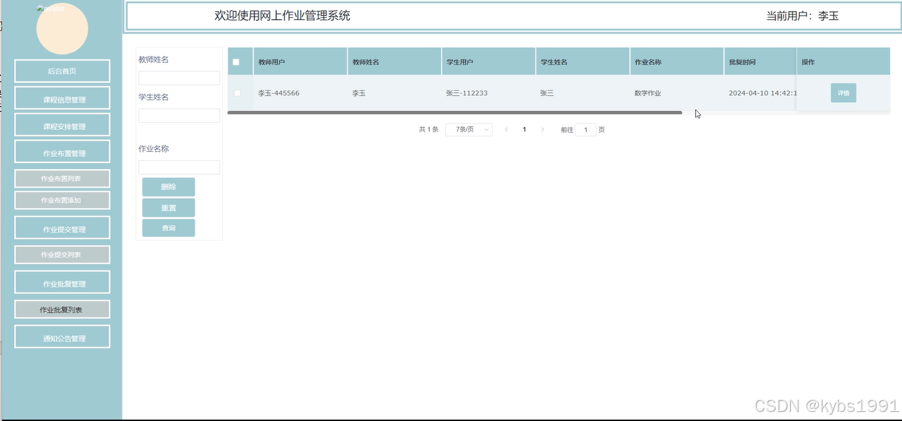 通过作业批复管理页面,用户可以浏览作业批复列表,查看批复详情,进行查询和重置操作,删除不需要的批复内容。通过教师姓名、学生姓名、作业名称进行搜索,便于查看和管理作业批复信息,如图5-7所示。