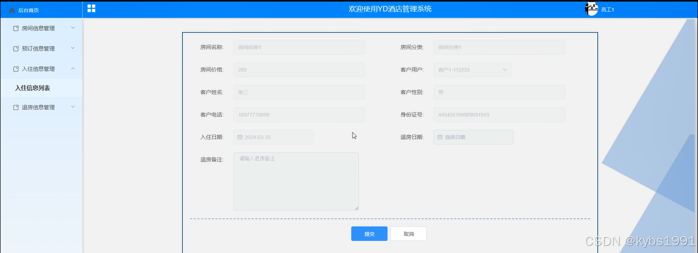 (4)入住信息管理:用户点击可查看入住信息列表,同时可点击“退房办理”并填写退房信息,包括退房日期和退房备注。