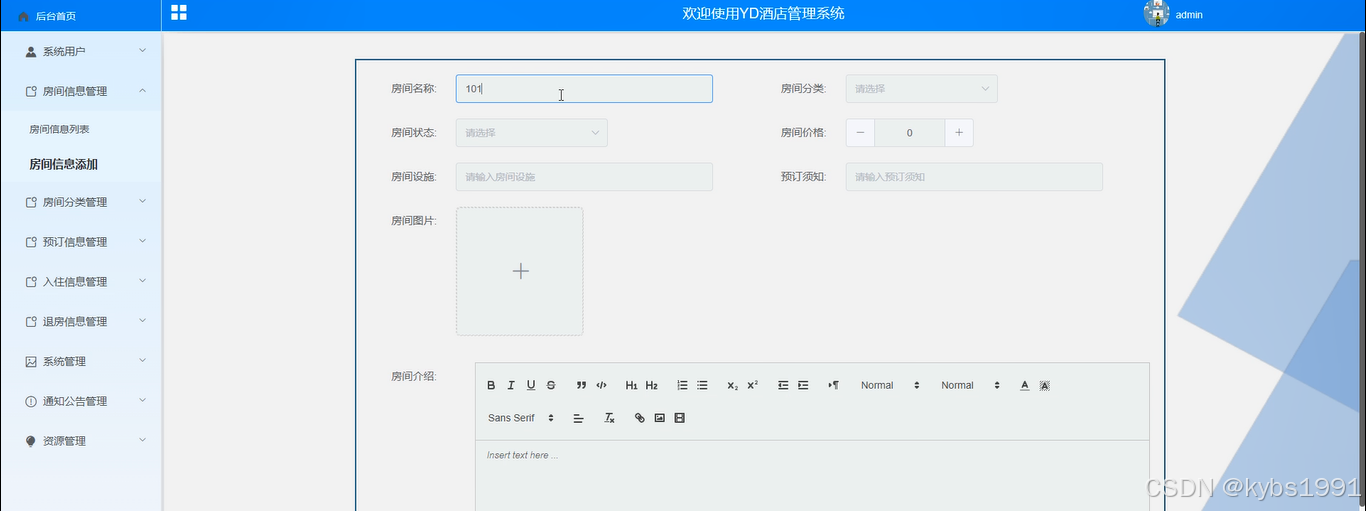(3)房间信息管理:管理员点击可点击房间信息列表和房间信息添加;点击“房间信息添加”,输入房间名称,选择房间分类、房间状态,输入房间价格、房间设施、预定须知,上传房间图片和输入房间介绍,点击“提交”按钮进行添加。