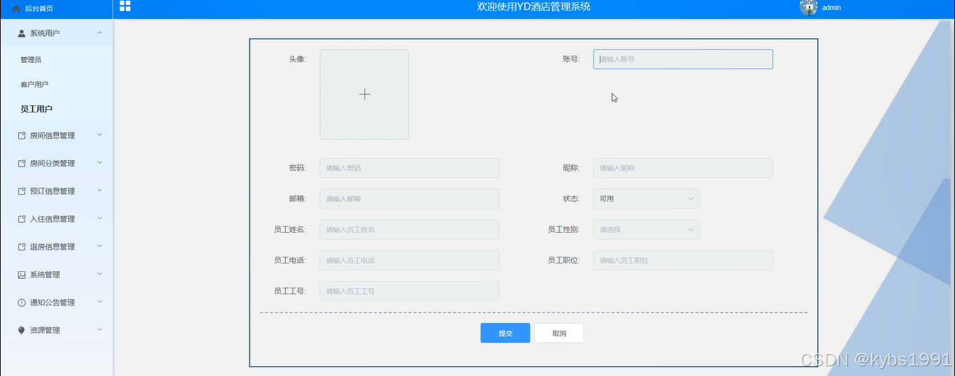(2)系统用户:管理员点击可查看管理员、客户用户和员工用户;如需添加员工用户,点击右侧“添加”按钮,上传头像,输入账号、密码、昵称、邮箱,选择状态,输入员工姓名,选择员工性别,输入员工电话、员工职位和员工工号,点击“提交”按钮进行添加。同时可对系统用户进行增删改查。