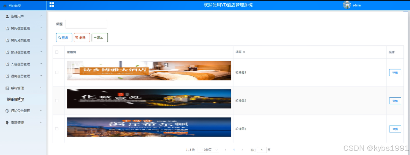 (8)系统管理:当管理员点击”系统管理“这一菜单时,可查看轮播图管理,如需添加新的轮播图,点击右侧”添加“按钮,上传轮播图,填写标题,点击“提交”按钮进行添加。同时管理员可对轮播图进行增删改查。
