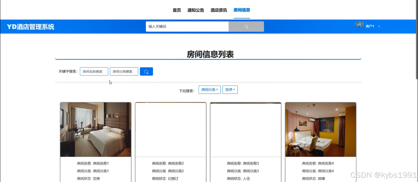 房间信息:用户点击可通过搜索房间名称和房间分类进行查看房间信息,同时可对房间信息进行点赞、收藏、评论和预定操作。界面如下图所示。
